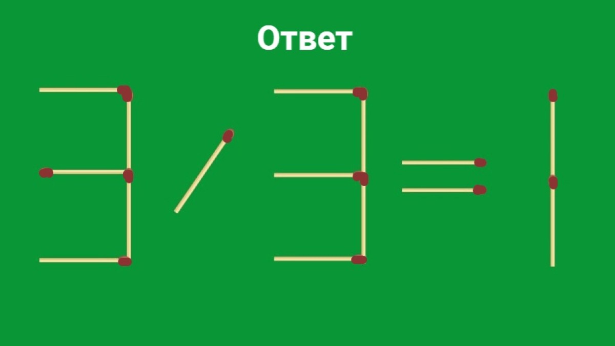 Ответ: нужно передвинуть спичку, чтобы получилось 3 / 3 = 1.