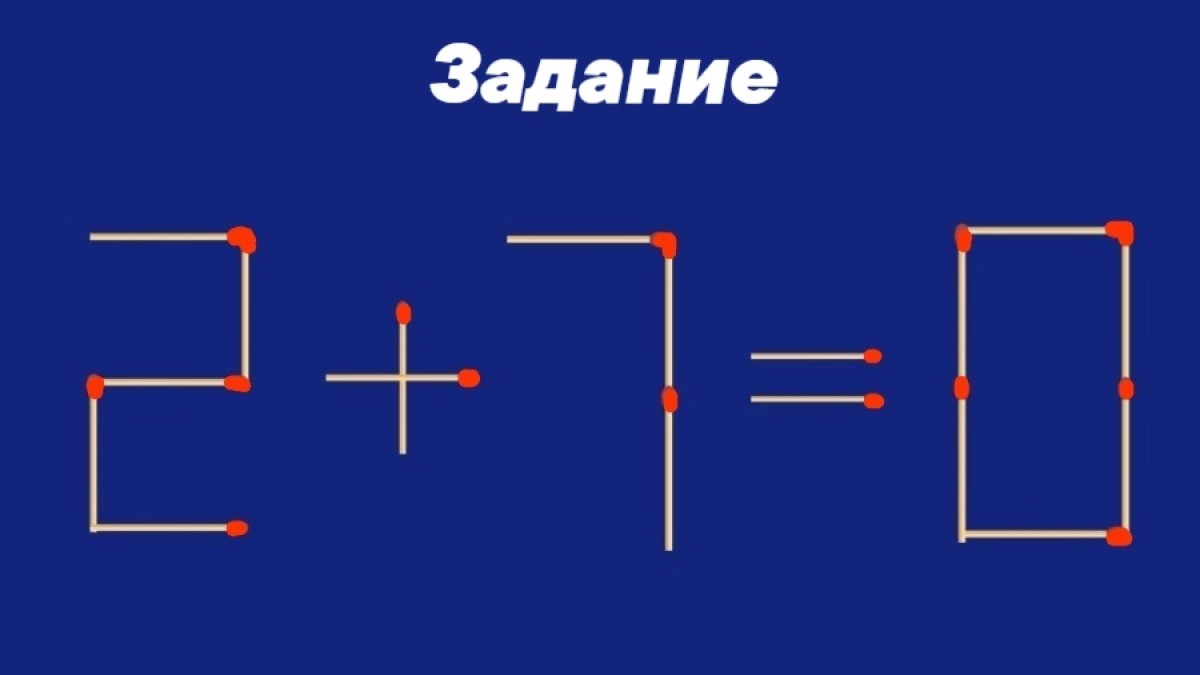 Переместите спичку из цифры 0, чтобы получилась цифра 9. Тогда пример станет таким: 2 + 7 = 9