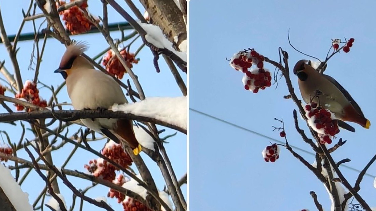 Наблюдательные мончегорцы запечатлели на камеру хохлатых свиристелей, уютно устроившихся среди ветвей заснеженной рябины.