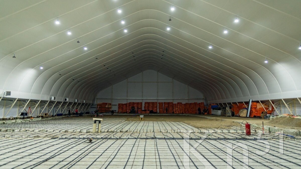 В Заполярном приступили к монтажу основания для искусственного покрытия катка, здание которого уже находится на финальной стадии строительства.