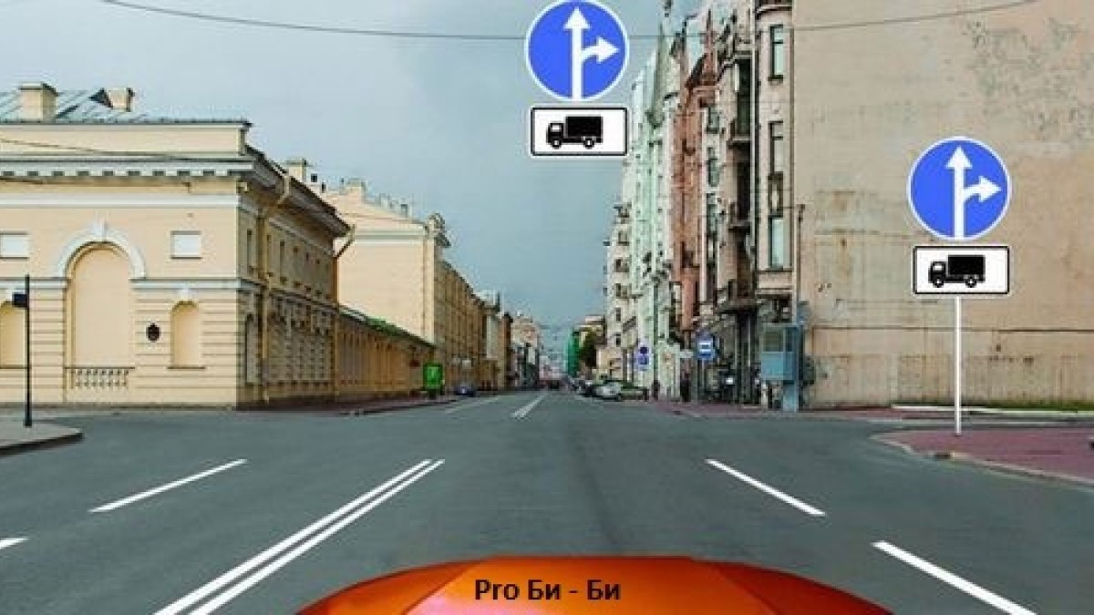 На рисунке есть знак «Движение прямо и направо» с табличкой, уточняющей, что это касается только грузовых автомобилей. Для легковых машин этот знак не действует.