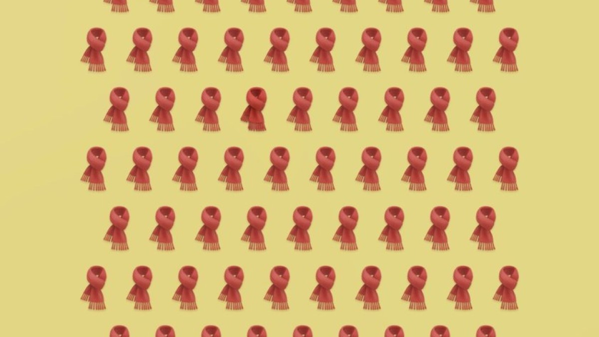 На картинке изображены шарфы, почти все одного оттенка красного, но среди них есть один другой. Сможете найти его за 20 секунд?
