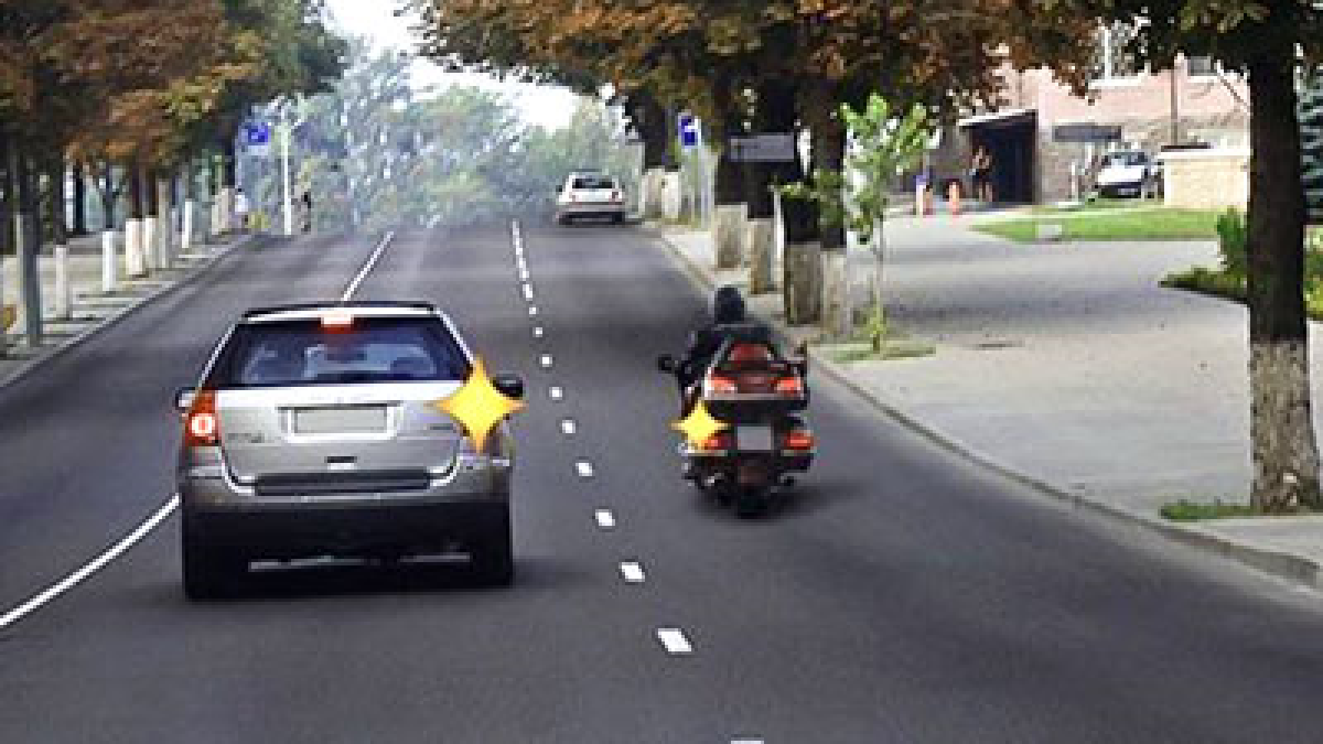 На рисунке показана ситуация: легковой автомобиль и мотоцикл движутся по параллельным полосам и одновременно собираются перестроиться. Кто должен уступить?