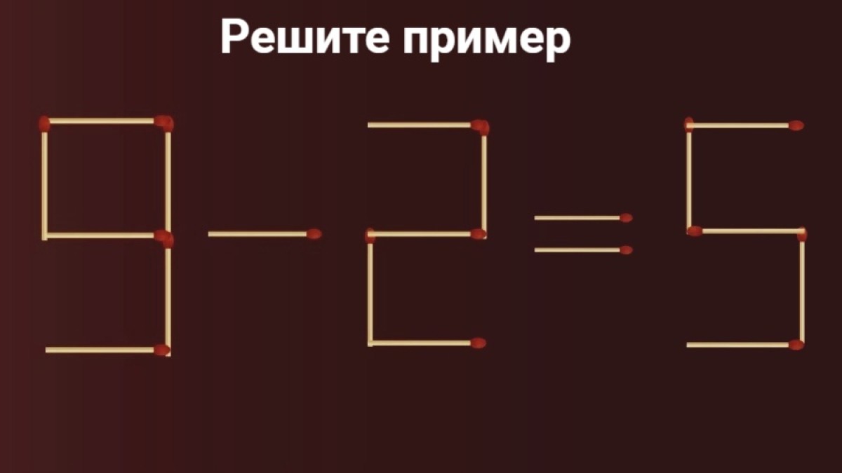 Теперь ответ. Нужно взять одну спичку из цифры 9 и перенести её на знак «минус». Тогда 9 превращается в 3, а сам пример становится таким: 3+2=5.