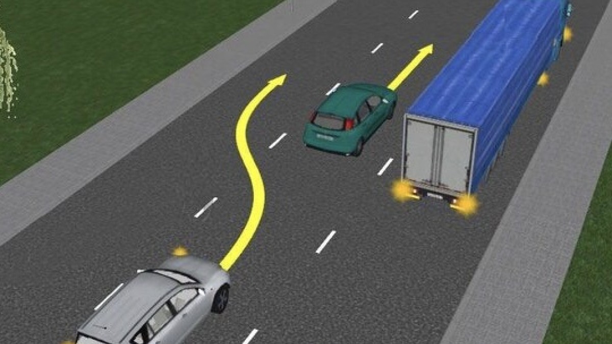 На дороге с трёхполосным движением грузовик остановился, а легковой автомобиль объезжает его по средней полосе. Серый автомобиль хочет выполнить опережение, выехав на крайнюю левую полосу.