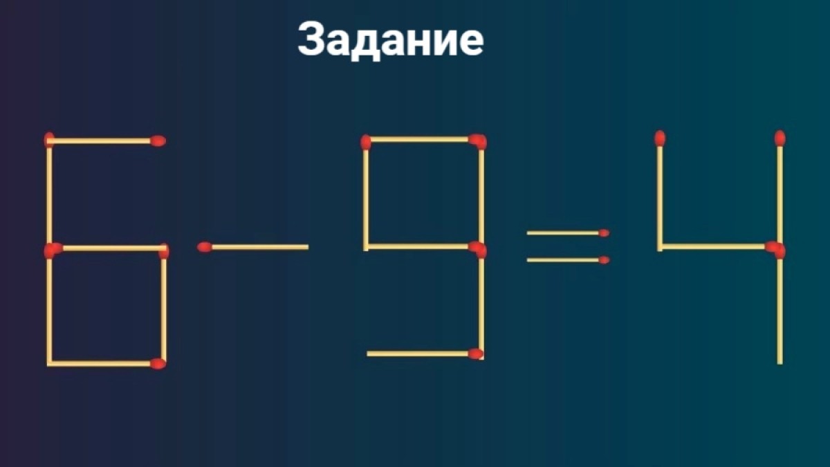 Дан пример: 6-9=4. Задача — сделать равенство верным, переставив всего одну спичку. На это даётся всего 10 секунд. Как думаете, получится?
