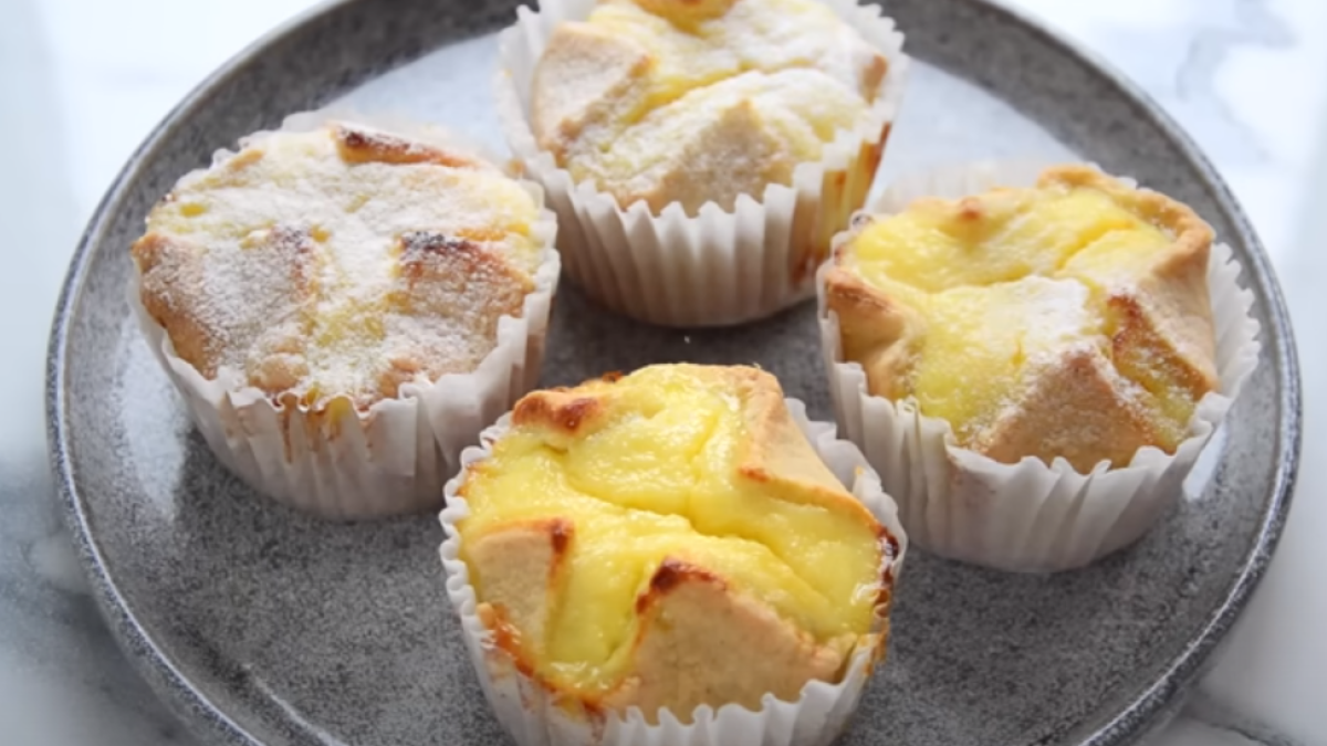 Тесто достаём из холодильника. Рабочую поверхность присыпаем мукой. Делим колобок пополам. Раскатываем в пласт, который разрежем на шесть одинаковых квадратов. Этими квадратами заполним форму для кексов так, чтобы уголки торчали наружу, то есть, были свободными. Наполняем каждое пирожное начинкой, а оставленные края квадратов защипываем, чтобы начинка не вытекла. Выпекаем 40-50 минут при 180 градусах.