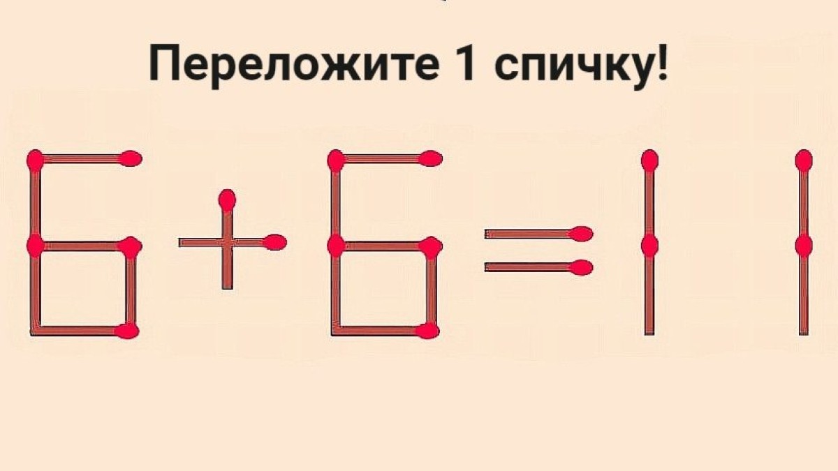 Перед вами при помощи спичек изображено неверное равенство «6+6 = 11». Ваша цель — переместить всего одну спичку, не ломая и не убирая ее, чтобы пример стал верным.