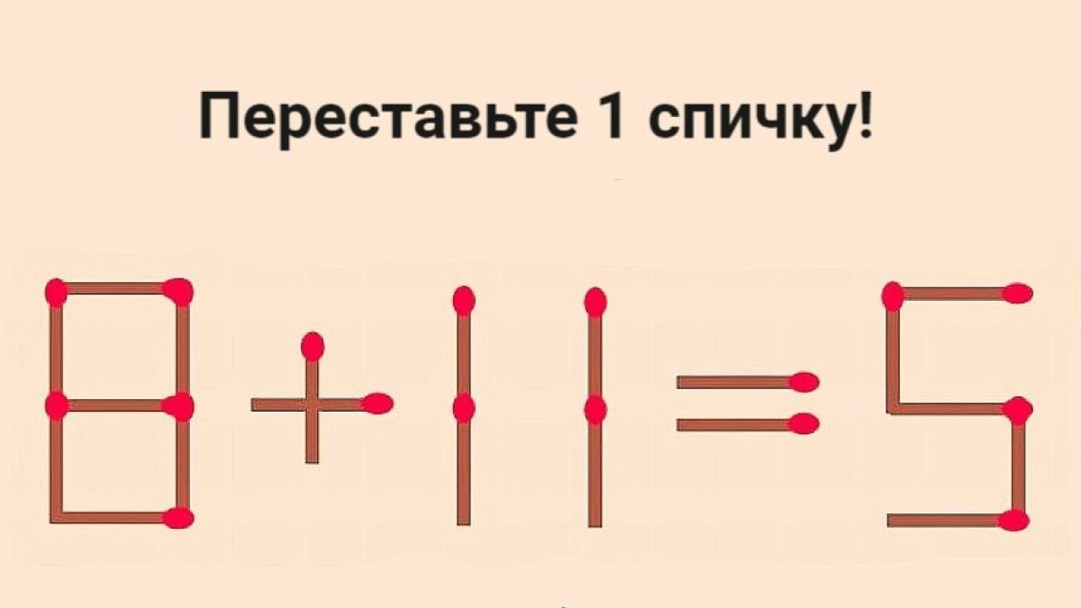Школьный пример составлен с помощью спичек, но равенство не является верным: 8+11=5. Переставьте 1 спичку так, чтобы результат оказался верным.
