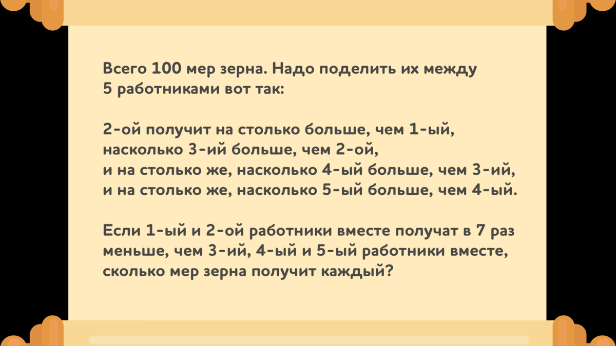 Надо поделить 100 мер зерна между 5-ю работниками так, чтобы 2-й получил зерна на столько же больше, чем 1-й, на сколько 3-й получил больше 2-го, 4-й больше 3-го, и 5-й больше, чем 4-й.