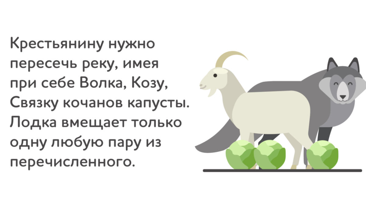Крестьянину потребовалось пересечь реку, имея при себе волка, козу и связку кочанов капусты. Лодка, которую он смог разыскать, вмещала за раз только любую пару из перечисленного.
