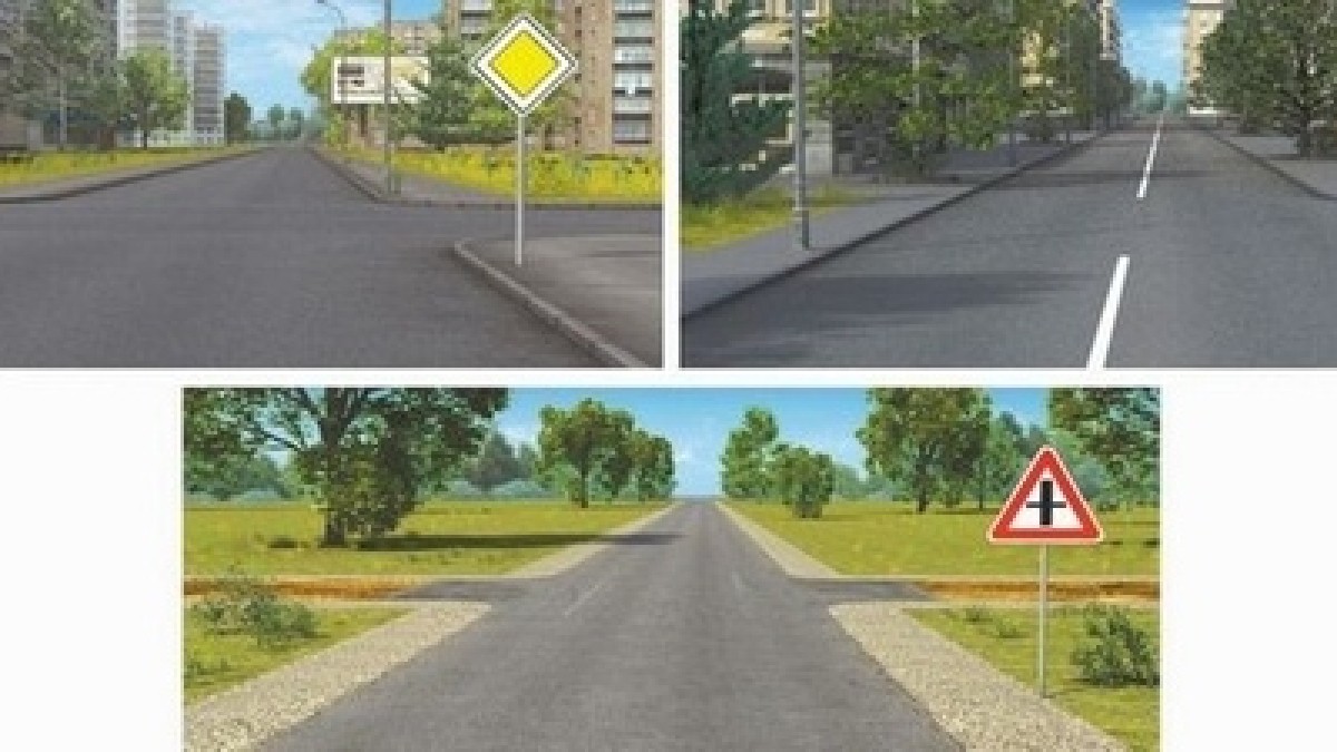 Главная дорога есть и на левом верхнем, и нижнем рисунках, на которых перед перекрестком есть знаки приоритета. На правом верхнем рисунке перед перекрестком установлен знак 6.8.2 «Тупик», который то есть просто даёт информацию, значит, этот перекресток является равнозначным.