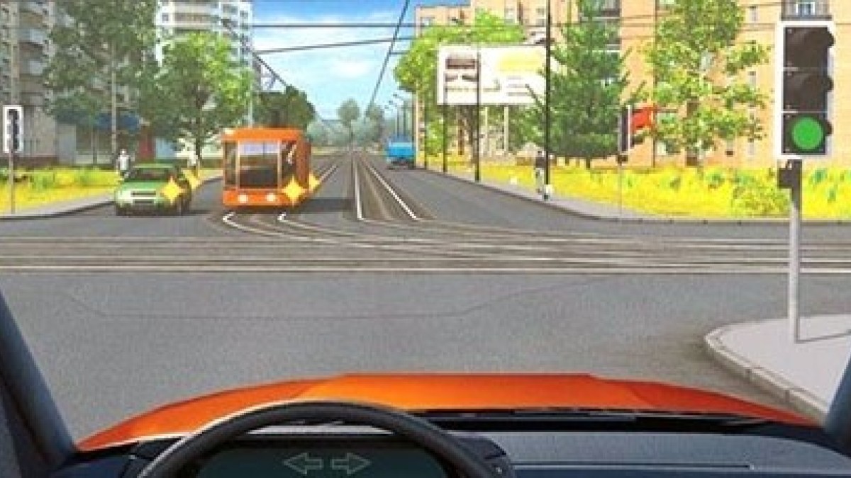 Кому из них вы должны уступить на перекрестке? Для всех транспортных средств горит зеленый сигнал светофора. Легковушка и трамвай хотят повернуть налево.