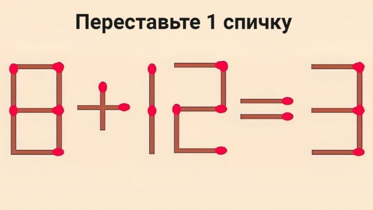 Предлагаем вам решить математический пример 8+12=3. Переставьте всего 1 спичку, чтобы получилось верное равенство.
