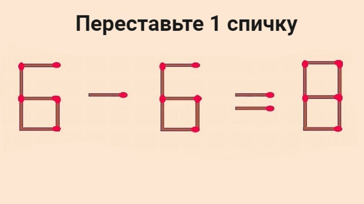 Необходимо так переставить 1 спичку в примере 6–6=8, чтобы получилось верное арифметическое равенство.