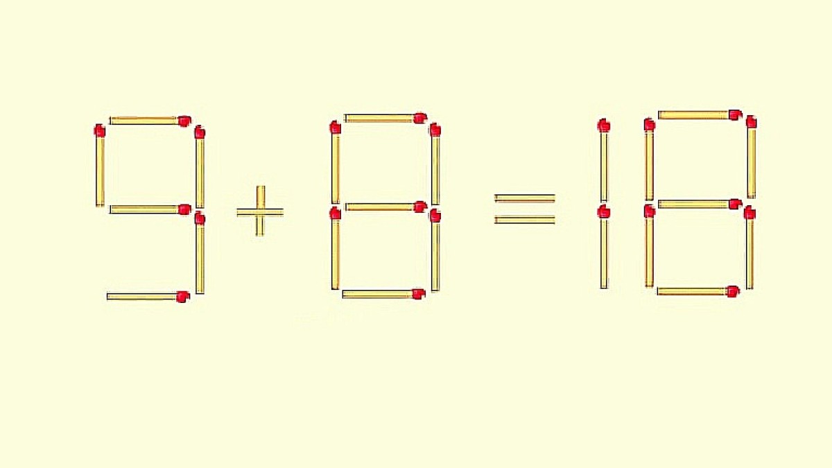 Перед вами головоломка со спичками: в равенстве 9+8=18 закралась ошибка. Нужно передвинуть всего одну спичку, чтобы уравнение стало верным.