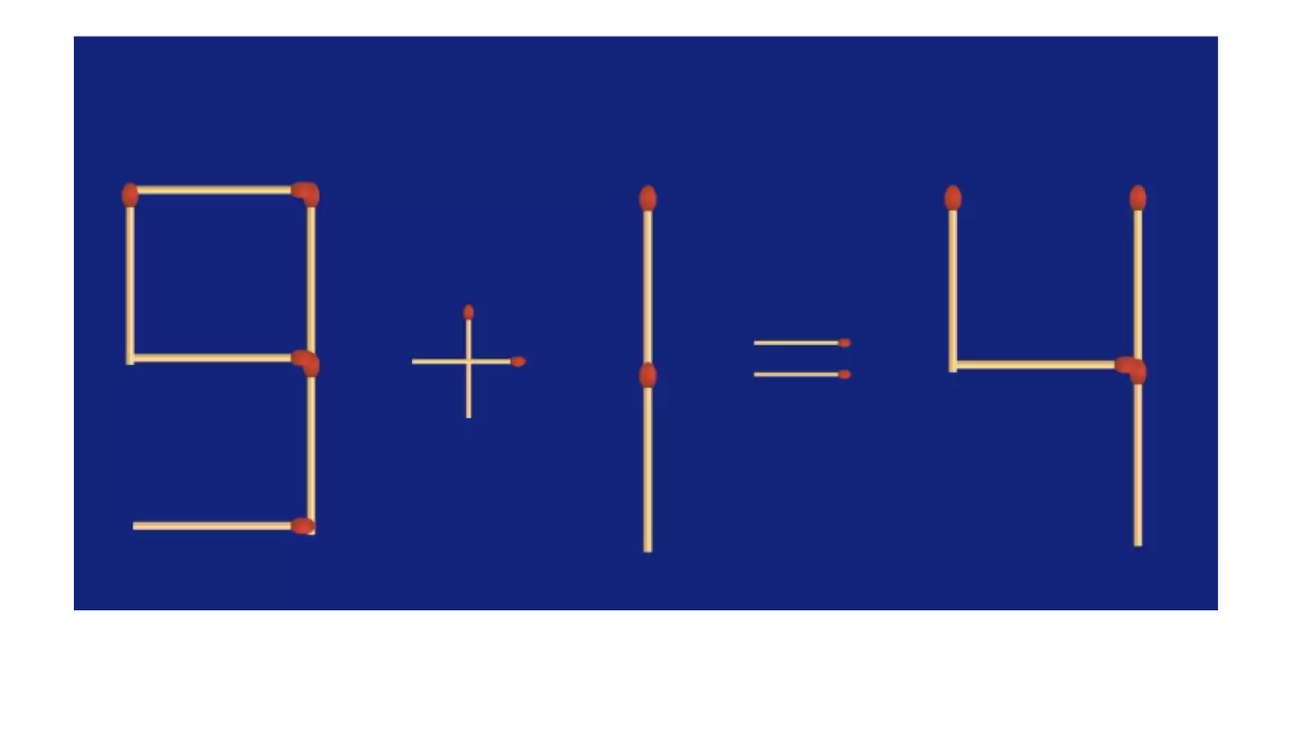 Перед вами неверное равенство: 9 + 1 = 4. Переместите всего одну спичку так, чтобы оно стало верным. Установите рекорд!