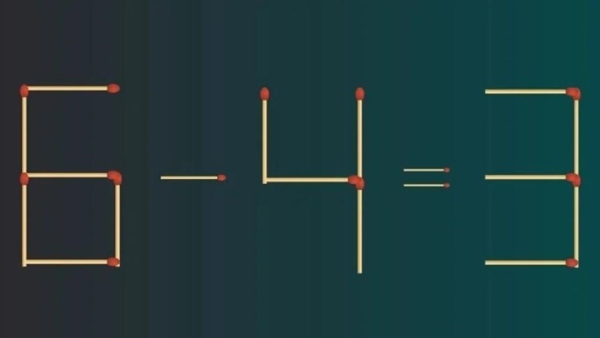 Перед вами уравнение: 6-4=3. Оно, разумеется, неверное. Переставьте только 1 спичку, чтобы сделать равенство правильным.