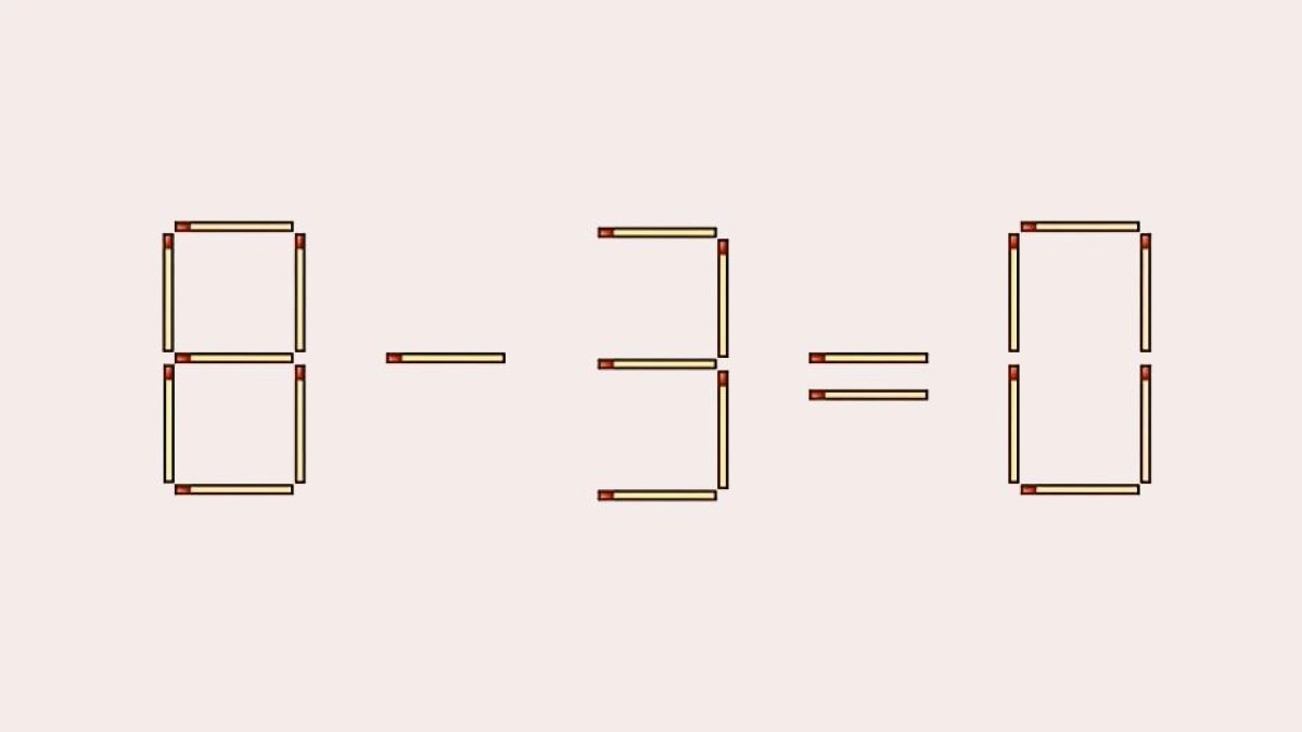 У вас всего 9 секунд. 8-3 не равно 0. Найдите, куда переставить 1 спичку, чтобы сделать равенство верным.