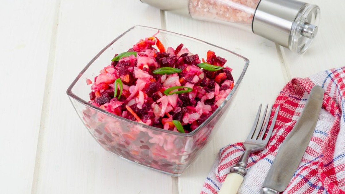 В новом салате из свёклы меньше ингредиентов, чем в классическом винегрете. Отсутствуют квашеная капуста, картофель и зелёный горошек. Но получается он вкуснее традиционного винегрета, а готовится гораздо проще.