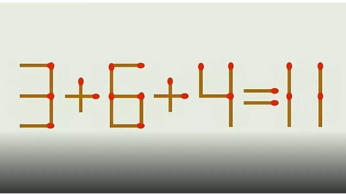 Вот равенство: 3 + 6 + 4 = 11. Но оно неверное. Ваша задача — переставить только одну спичку, чтобы всё стало правильно.