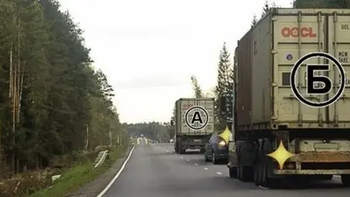 Грузовик Б, который движется позади, уже начал обгон. Создавать ему помеху запрещено! Если легковой автомобиль тоже начнёт обгон, это может привести к аварийной ситуации. (Пункт 11.2 ПДД)