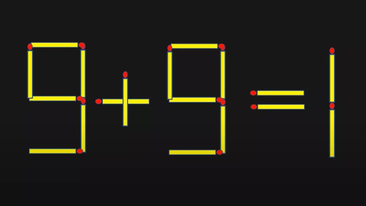 Предлагаем посмотреть на изображение, на котором спичками выложено неверное равенство. Исправьте запись «9+9=1» так, чтобы равенство стало верным. Переместить разрешается только одну спичку.