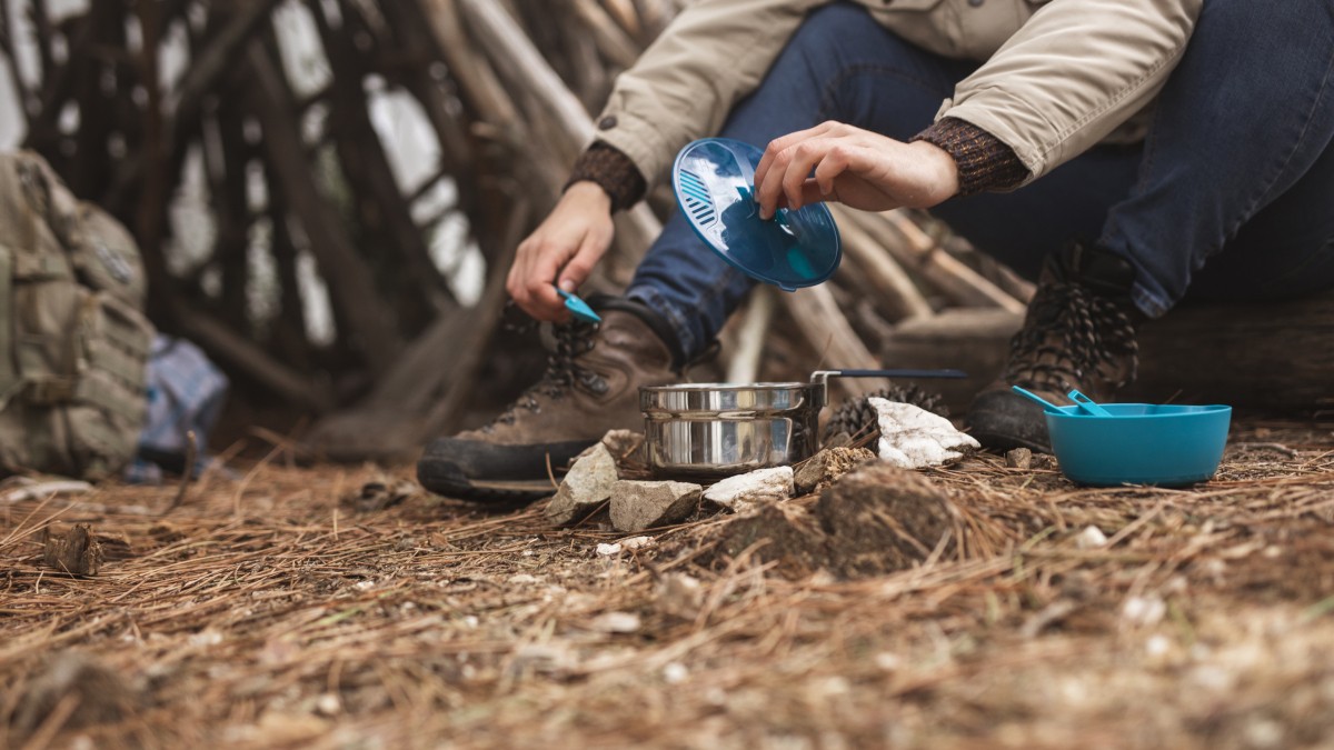 Устанавливаю печь на ровную поверхность, наполняю щепками и поджигаю. Сверху кладу металлический крест, на который удобно ставить кружку с водой.