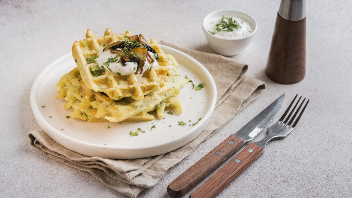 Для луковых вафель обжариваю лук, добавляю соль, перец, яйцо, кефир, сыр и сухой чеснок. Вмешиваю муку, выпекаю в вафельнице. Отлично будет с яйцом пашот или овощами.