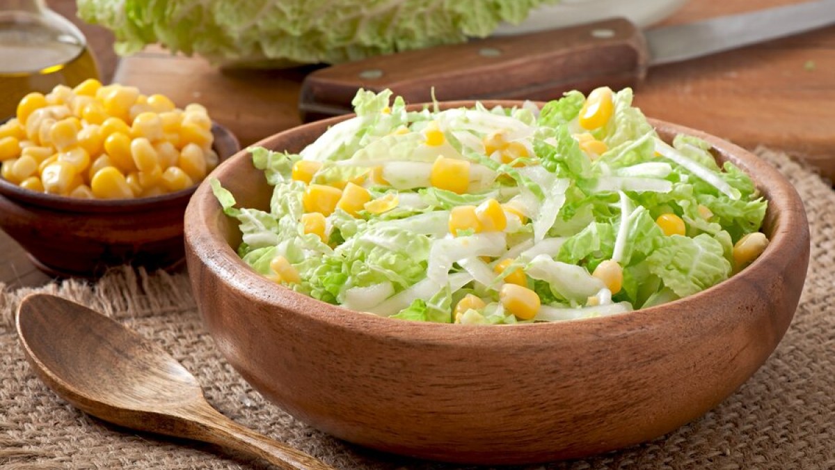 Необходимые ингредиенты: 500 г капусты пекинской, 250 г томатов, 250 г кукурузы консервированной, 150 г сметанки (можно использовать майонез), зелень и специи по вкусу.