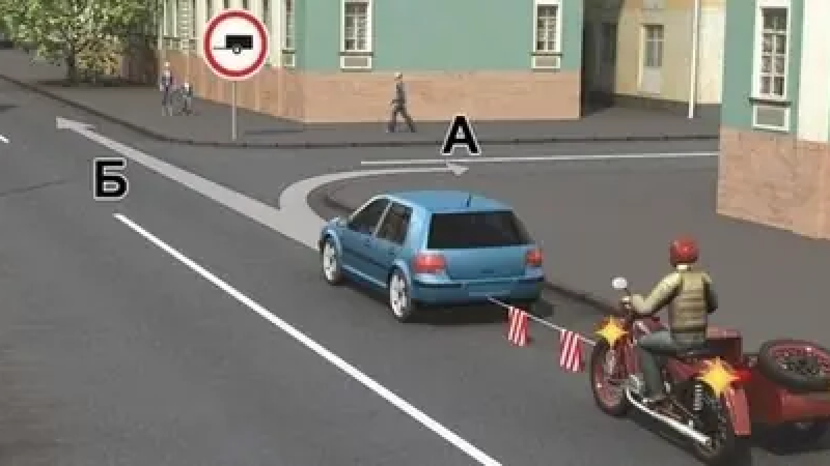 Знак 3.7 «Движение с прицепом запрещено» запрещает буксировку механических ТС и движение грузовых автомобилей и тракторов с прицепом. Разрешено только людям, которые проживают, работают или обслуживают предприятие в зоне действия знака. То есть здесь буксировку можно продолжить только в направлении «А». («Дорожные знаки»)