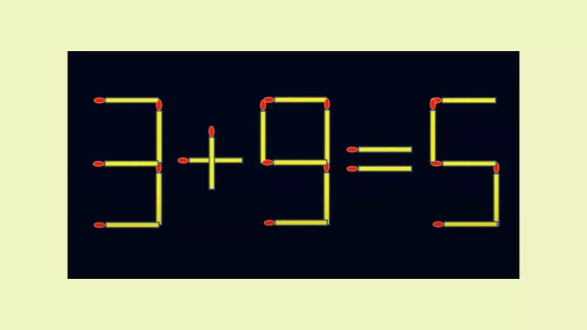 Посмотрите на иллюстрацию, где представлена визуальная головоломка. Из спичек составлено неверное равенство «3+9=5». Вы сможете исправить ошибку, если переместите всего одну спичку в этой записи.