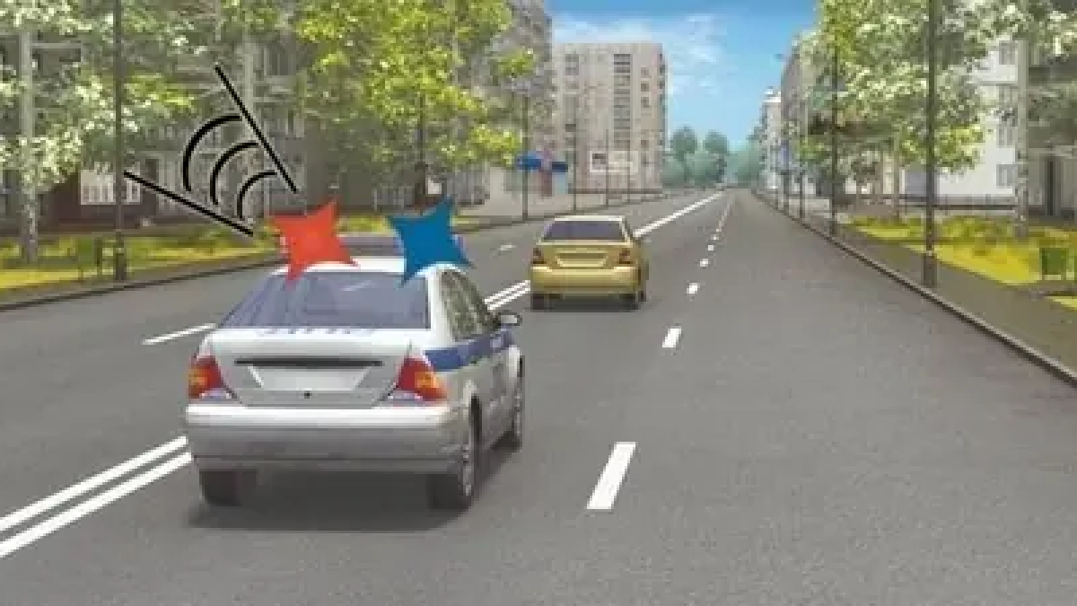 При приближении автомобиля полиции с включёнными маячками и сиреной водитель должен уступить. Нужно перестроиться на правую полосу и продолжить ехать, не мешаться спецтранспорту. (Пункт 3.2 ПДД)