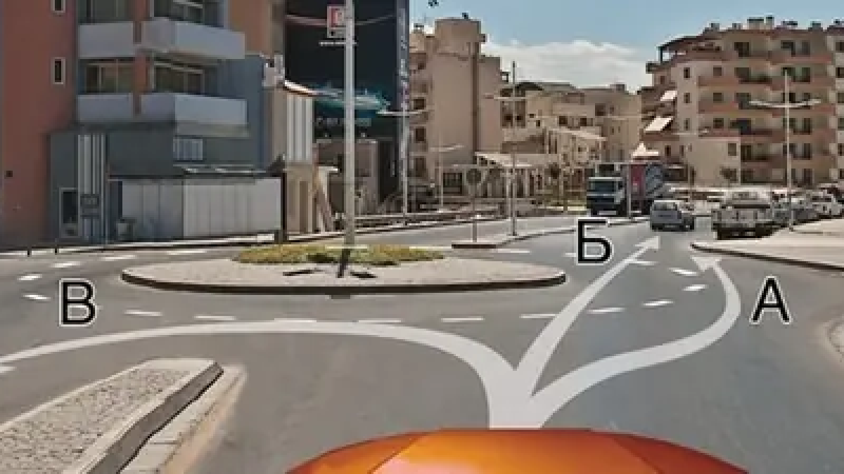 Траектория В пересекает встречное движение, что на перекрёстке с круговым движением запрещено. Въезд на такой перекрёсток допускается с любой полосы, предназначенной для движения в данном направлении. При повороте направо транспортное средство должно двигаться ближе к правому краю проезжей части, если это возможно. (Пункты 8.5, 8.6 ПДД)