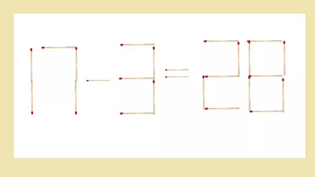 На нашей иллюстрации показана визуальная задачка. Из спичек составлено неверное равенство «17-3=28», в котором необходимо исправить ошибку. Для выполнения законов арифметики потребуется переместить одну спичку.