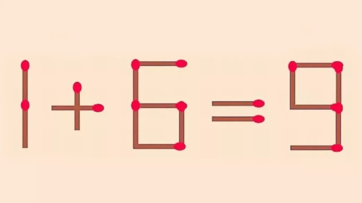 Посмотрите внимательно на изображение, перед вами математический пример «1+6=9», в который закралась ошибка. Для исправления равенства переместите одну из спичек в записи.