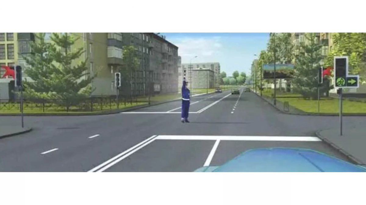 Поднятая рука регулировщика означает запрет движения во всех направлениях. Работающий светофор не имеет значения, в этой ситуации приоритет у регулировщика. Даже если движение кажется разрешённым, нужно следовать только жестам инспектора.