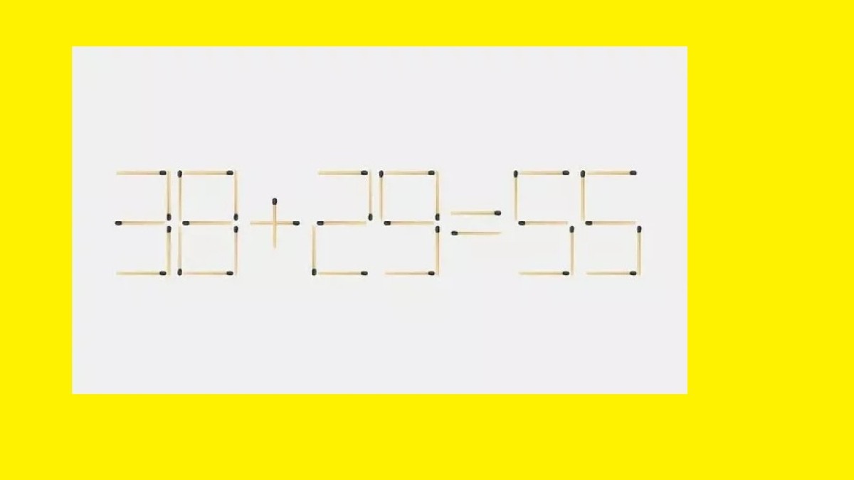 Перед вами на рисунке представлена математическая загадка. Пример «38+29=55» содержит ошибку, для исправления которой разрешается переместить всего одну спичку в этой записи.