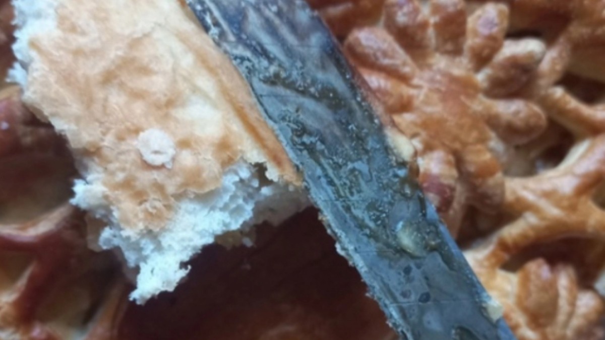 Северяне приложили фото пирога с капустой и металлическим предметом. На фото видно, что лезвие буквально вмонтировано в тесто, однако нашлись скептики, которые уверены в подлоге.