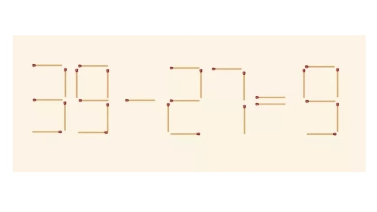 Вот на картинке перед нами равенство «39-27=9», содержащее ошибку. Для исправления записи разрешено переставить всего одну спичку. Внимательность и логика помогут вам отыскать ответ.