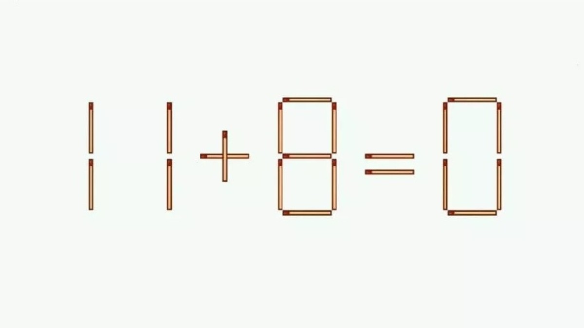 Вам дано изображение математического равенства «11+8=0», содержащего ошибку. Необходимо сделать запись верной, переместив только одну спичку, не ломая и не убирая ее.
