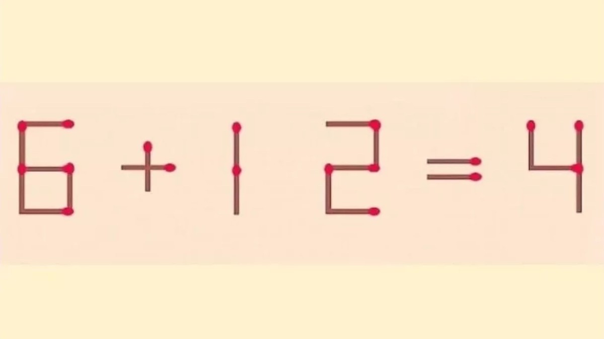 На рисунке представлено неверное равенство «6+12=4», в котором требуется исправить ошибку. Переместите всего одну спичку, и пример станет верным. Пространственное мышление пригодится в таком вопросе не меньше логики.
