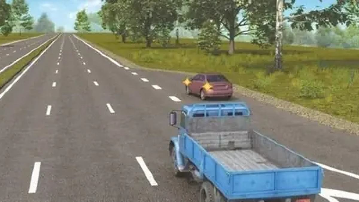 3. Должен проехать первым, так как он едет справа от грузовика