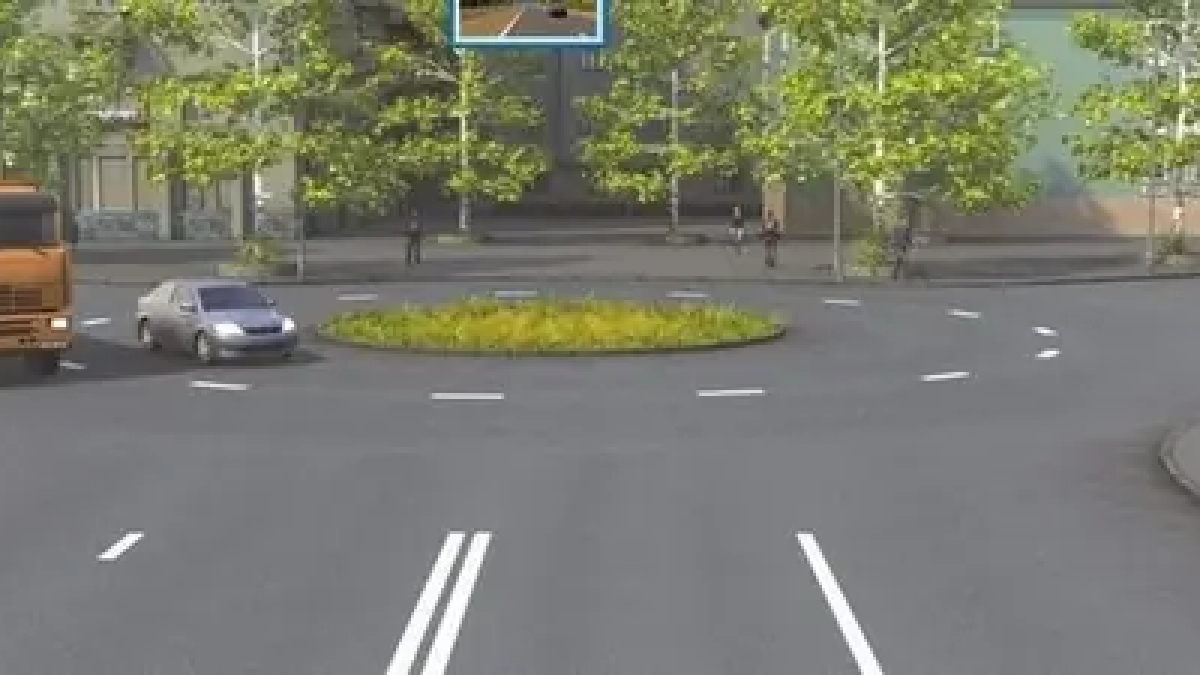 Въезд на перекрёсток с круговым движением разрешён с любой полосы без предварительного перестроения. Выезд осуществляется по общим правилам, а значит, для поворота направо надо заранее занять крайнюю правую полосу. Здесь же легковое ТС не находится в крайнем правом положении, поэтому оно не может сразу повернуть направо. («Дорожные знаки», пункты 8.5, 8.6 ПДД)