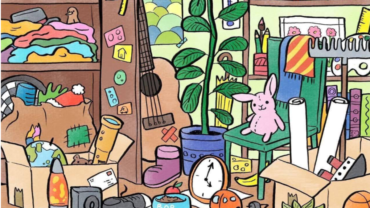 На изображении представлена комната с большим количеством вещей. Где-то в ней спрятан слоник, которого и нужно найти.