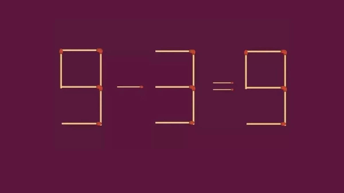 На рисунке вы видите неверное равенство «9-3=9». Необходимо исправить ошибку в этой записи, переместив всего одну спичку. Ломать или убирать ее нельзя, все честно.