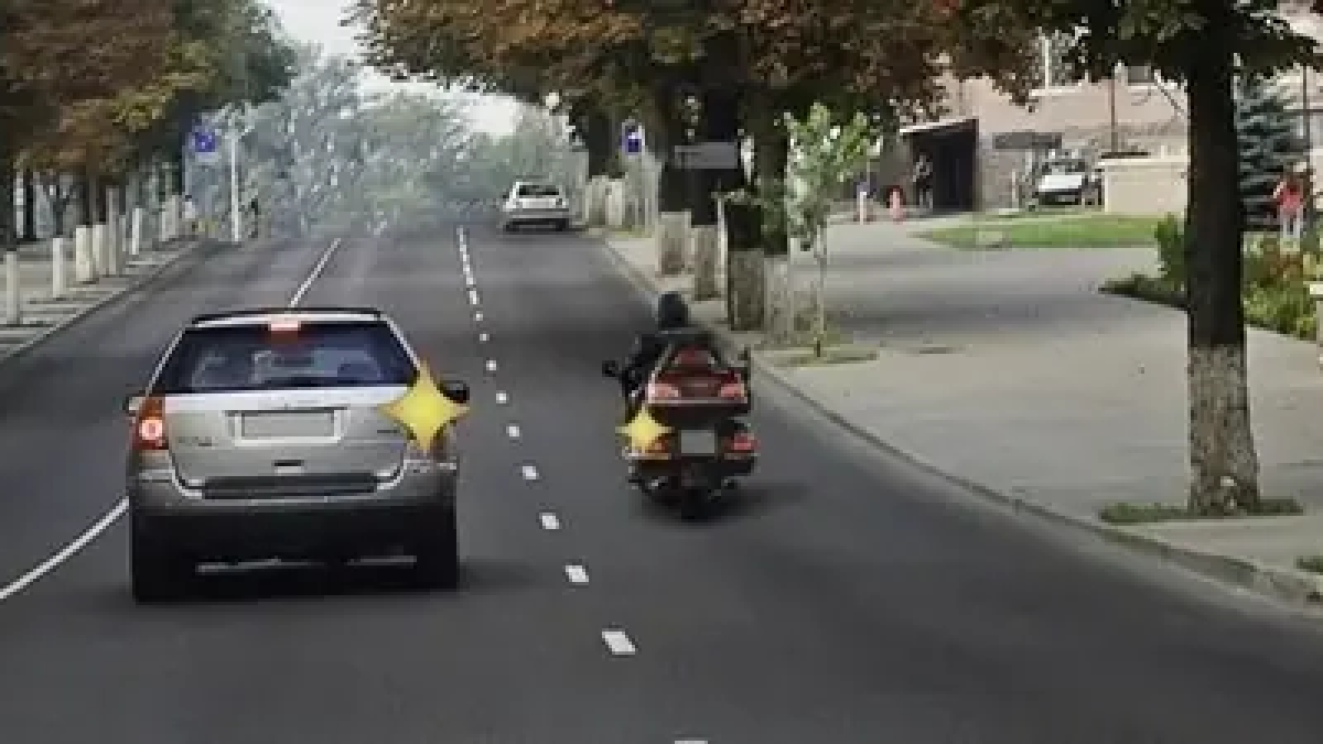 При одновременном перестроении применяется «правило правой руки». Водитель, у которого помеха справа, обязан уступить дорогу. Таким образом, водитель легкового автомобиля обязан уступить дорогу мотоциклисту. (Пункт 8.4 ПДД)