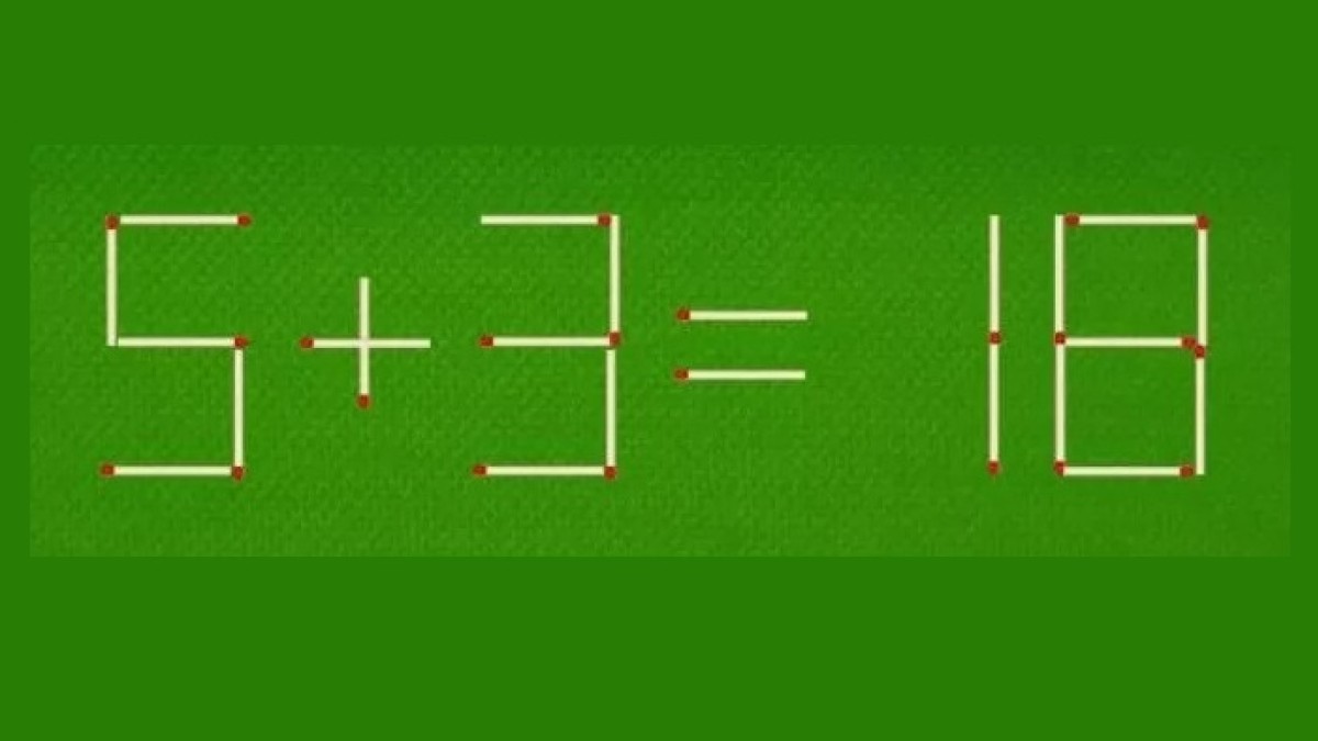 Обратите внимание на иллюстрацию. Перед вами равенство «5+3=18», составленное с ошибкой. Необходимо переставить две спички, чтобы запись стала верной. Обладатели высокого интеллекта найдут решение менее чем за 10 секунд.
