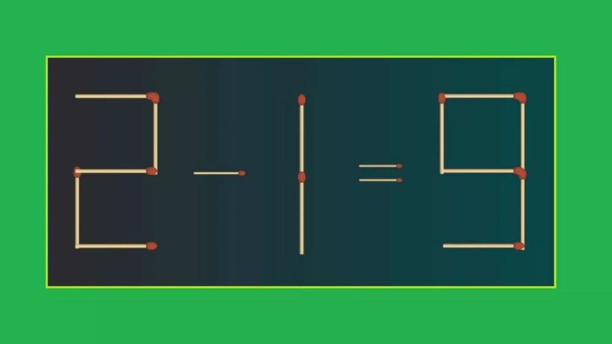Пришло время проверить ваш мыслительный потенциал в решении одной из таких задачек. Обратите внимание на рисунок, дано изображение неверного равенства «2-1=9». Пример составлен из спичек, и теперь нам требуется переставить одну из них, чтобы сделать запись корректной.