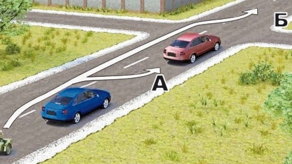 Здесь траектория «А» не пересекает сам перекрёсток, поэтому только она разрешена для обгона. (Пункт 11.4 ПДД)